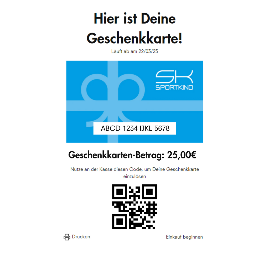 Give away joy with gift vouchers from SPORTKIND. The vouchers are available with a value of €10.00 to €200.00 and are a perfect gift for all sports fans. And what's more, it's an ideal gift for those of you who decide spontaneously: you'll receive your gift card by email immediately after you've placed your order.