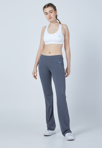 grey jazz trousers for women and girls with a wide waistband, 32 inch long straight leg and shaping flatlock seams at the sides. The fine microfibre gives the body maximum freedom of movement and protects it from UV rays 50+. The material ensures optimum moisture management and keeps the body pleasantly cool and dry even during top sporting performance.