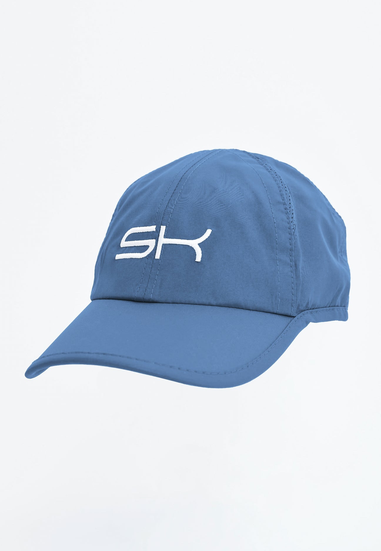 The lightweight panel-6 grey blue sports cap with white logo has four inbuilt mesh inserts to ensure good air flow and breathability. This cap has an integrated terry sweatband quickly absorbing sweat and an adjustable strap on the back of the cap for a customisable and comfortable fit. The bottom of the cap's peak is black to reduce the brightness of the light, this combined with a fabric that provides optimal protection from intense sunshine on a tennis court or golf course means this cap is perfect for sunny days. The cap is available in two different head sizes: 53-56cm and 57-59cm.